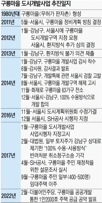 하지만, 보상금 문제로 2020년에 다시 임대주택 4000세대 공급으로 확장하는 사업을 계획하였으며, 기존 거주자 1100여 세대를 재정착시 키겠다는 방침이었으나, 2022년 2월 더불어민주당은 대선 공식 선거운동 첫날 갑자기 구룡마을 사업에 12,000세대의 주택을 공급한다는 계획을 세웠습니다. 현재는 대부분 다 떠나고 남은 650여 명의 주민에게 최대한 보상금을 지원하고 입주권도 제공하여, 현재 화재도 많이 나고, 여름철 폭우로 인한 피해로 사망사고가 항상 일어나는 문제를 막아야 한다고 주장하기도 했습니다.