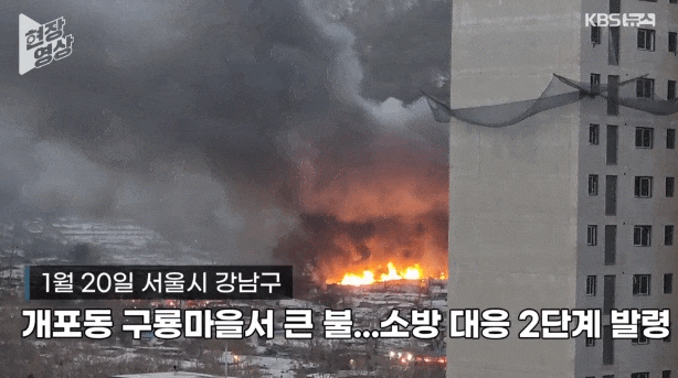 1월 20일 오전 6시 28분, 서울 강남구 개포동 구룡마을 4 구역 주택에서 큰 화재가 발생하여, 소방당국이 출동하였으며, 소방당국은 구룡마을 거주자 약 500명을 대피시켰습니다. 강남구청에 따르면 구룡마을에는 현재 666 가구가 살고 있는 것으로 파악되고 있습니다.