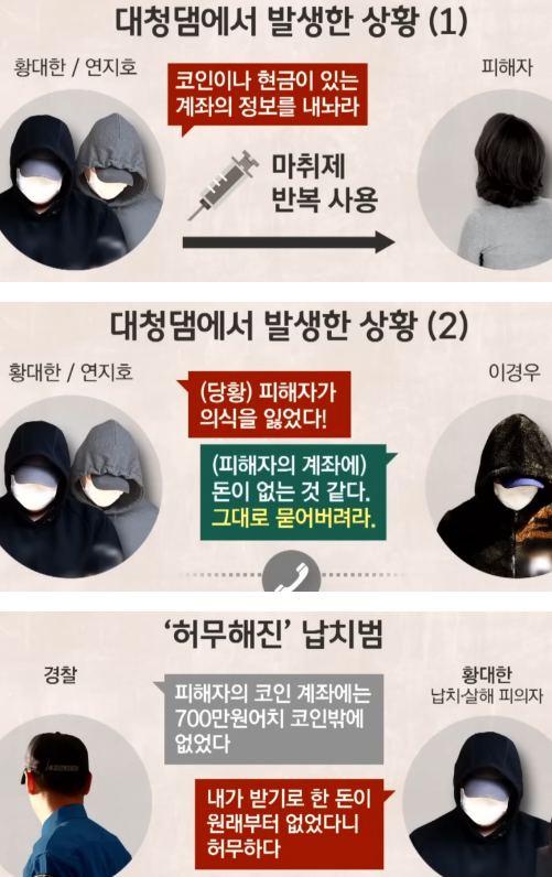 황대한과 연지호는 여성 피해자를 납치하여, 핸드폰 4대와 현금이 들어있는 가방을 빼앗았으며, 코인계좌 비밀번호를 알아낸 뒤, 계좌를 열려고 했지만 실패하자, 이들은 계획대로 48세의 피해자를 살해한 후, 시신을 암매장한 것으로 드러났습니다.