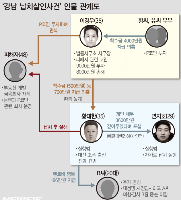 경찰은 이경우 씨가 투자손해를 빌미로 시작한 범행이 황 씨와 유씨 부부로 연결되어, 이경우씨가 모든 살인계획을 짜서, 조폭출신인 황대한과 연지호는 범행을 직접 한 것으로, 유씨와 황씨 부부는 1억 원의 P코인을 구매하였으며, 이들은 P코인의 홍보와 마케팅 업무를 맡았다고 합니다. 이 부부와 피해자 여성은 이미 서로 시세조종 의혹을 거론하며 소송 전을 벌이던 상황이었다고 밝혔습니다.