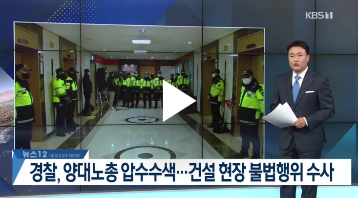 1월 19일 오전 8시 10분 서울경찰청 강력범죄수사대는 노동조합의 채용 강요와 공갈 협의로 건설현장 불법행위 수사를 위하여 한국노총과 민주노총 등 8개 사무실에 대해 압수수색을 실시하였습니다. 수사당국이 국가보안법 혐의에 이어 연이틀 강제수사에 나서면서 노동계의 반발도 예상되고 있습니다.