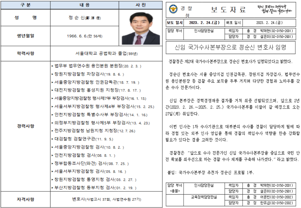 정순신 변호사는 1966년 6월 6일생으로 서울대학교 법대를 졸업한 뒤, 1995년 제37회 사업시험에 합격을 한 뒤, 2001년부터 부산지방검찰청 동부지청 검사로서 첫 국가행정직을 진행하였으며, 2013년 의정부지방검찰청 형사 제5부 부장검사를 지냈으며, 2020년에는 법무부 용인분원 분원장 생활을 하다, 이번에 경찰청은 제2대 국가수사본부장으로 정순신 변호사를 임명하였습니다.