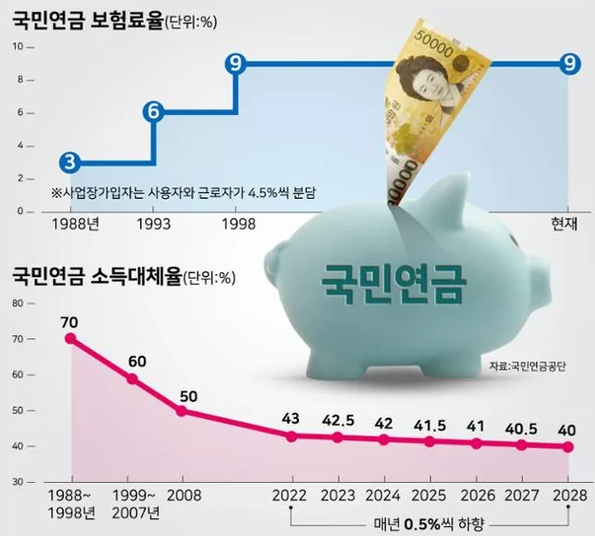 따라서, 25년째 9%로 동결된 보험료율을 12~15%로 올려야 한다는 게 주된 논의 대상입니다. 향후 4~5년 이내에 최소한 13~14%까지의 보험료율 인상이 이뤄져야 국민들이 최소한의 국민연금을 받을 수 있다는 전망입니다.