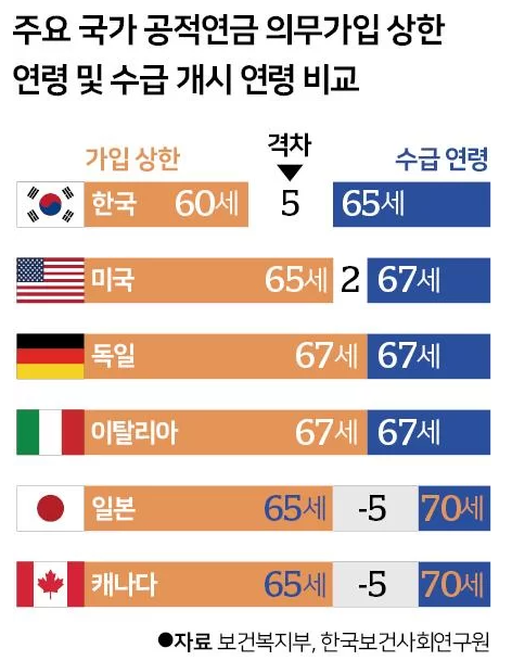 이로써, 한국은 기존 60세까지 납부하던 국민연금을 을 65세까지 납부로 연기할 예정이며, 이는 즉, 연금 수급개시연령인 65와 맞춰지는 것이게 됩니다. 주요 선진국을 보시면, 미국, 일본, 캐나다는 65세까지 연금을 납부하며, 미국은 67세부터, 일본과 캐나다는 70세부터 연금을 받고 있으며, 독일과 이탈리아는 67세로 의무가 입상한 연령과 연금 수급개시연령을 맞춘 것으로 나타났습니다. 또한, 한국이 가입 상한 연령도 가장 짧았으며, 수급 연령도 가장 빠른 것으로 나타났기 때문에, 한국도 주요 선진국과 비슷하게 맞춰나가자는 방안으로 개정되게 됩니다.