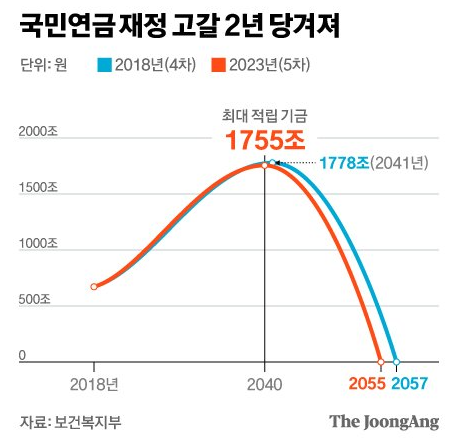 향후 국민연금은 20년간 지출보다 수입이 많은 구조가 유지되며, 현재 915조 원인 국민연금 기금은 2040년 1755조 원으로 정점을 찍을 예정이며, 매년 수지적자가 발생하면서, 2055년에는 바닥을 보일 것으로 예상하고 있습니다. 따라서 국민연금 가입자가 월 소득의 4분의 1을 연금 보험료로 내야 합니다.