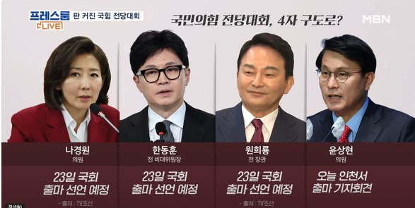 한 때, 유승민 후보도 국민의 힘 대표로 유력한 당선 후보자였지만, 전당대회 불출마를 선언했으며, 유승민은 본인의 페이스북에 무의미한 도전이라는 결론을 내렸으며, 변하지 않으면, 망한다는 절박함이 시작될 때 저의 역할을 다하겠다고 밝혔습니다. 따라서, 나경원, 한동훈, 원희룡, 윤상현 등의 4명의 후보가 국민의 힘 대표로 출마를 선언하게 되었습니다.