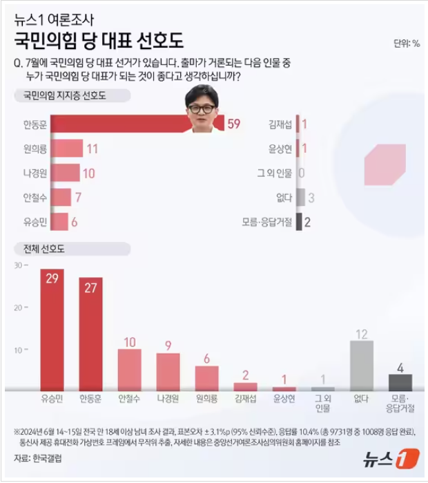 차기 국민의 힘 당대표 구도에서 한동훈 전 국민의 힘 비상대책위원장이 압도적인 지지율을 보여주고 있는 가운데, 한동훈의 지지율은 약 59%에 이르는 것으로 드러났습니다. 최근 '어대한'이라는 신조어까지 만들게 된 한동훈은 '어차피 당대표는 한동훈'이라는 분위기가 이어질 것으로 보입니다. 지난 총선 때에는 국민의 힘이 많은 득표를 받지 못했지만, 이는 한동훈의 잘못이 아닌, 윤석열과 김건희의 잘못이라는 분위기가 이어진 것 같습니다.