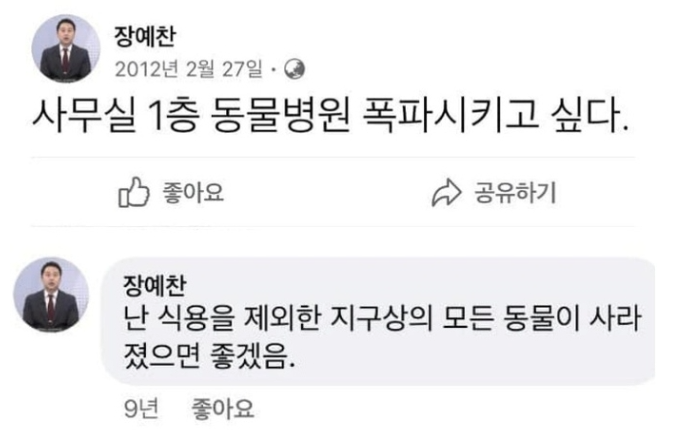 사무실 1층 동물병원을 폭파시키고 싶다라는 내용과 난 식용을 제외한 지구상의 모든 동물이 사라졌으면 좋겠다는 문구를 페이스북에 적었으며, 극우 성향의 단체 활동도 논란이 된 적이 있습니다.