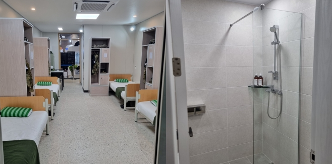 각 생활관별로 1인용 침대를 포함하여 관물대함이 있으며, 각 생활관에는 4인이 한 공간을 사용하는 구조로되어 있으며, 에어컨도 설치되어 있으며, 생활관 안에 화장실과 샤워실도 구비되어 있습니다. 또한, 샤워를 위해 목욕 바구니와 속옷을 들고 선임들 눈치를 보며 복도를 뛰어다니지 않아도 되겠네요. 더욱더 놀란 것은 세탁기와 건조기가 함께 배치되었다는 점이며, 쾌적한 에어컨과 난방시설을 유지할 수 있는 쾌적한 군대생활관의 모습을 볼 수 있겠네요.