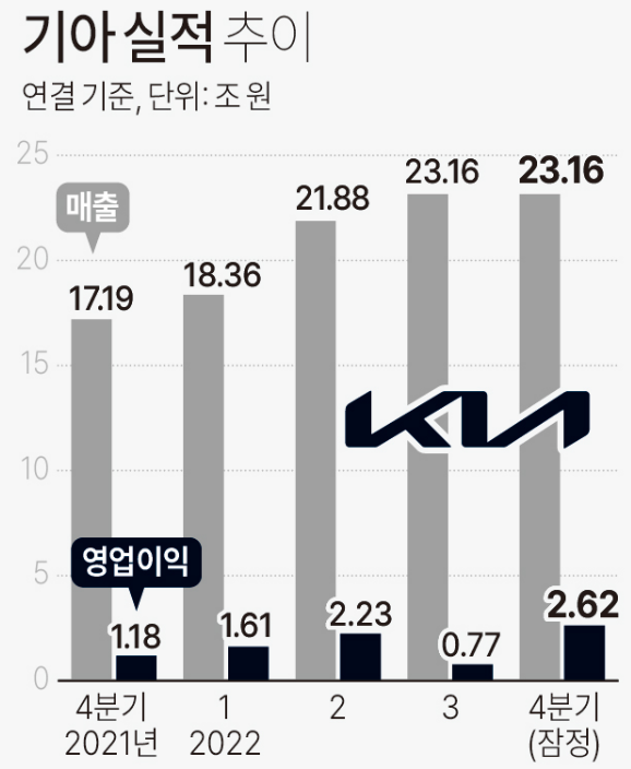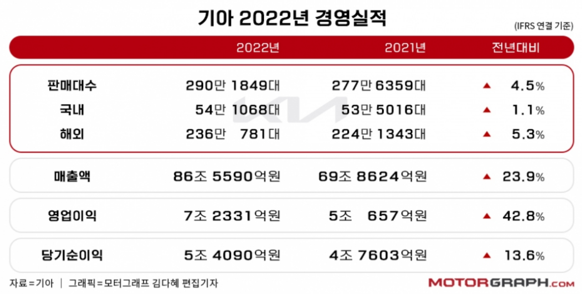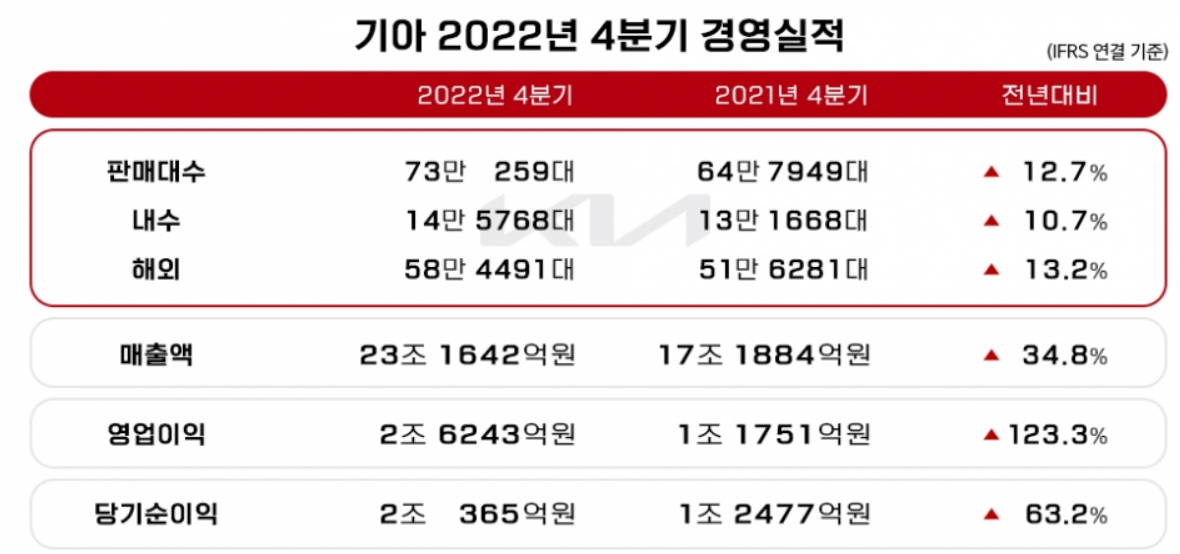 기아도 전날 2022년도 4분기 실적을 발표하며, 현대차와 함께 역대 최대 이익을 발표했습니다. 기아차는 국내에서 54만 대, 해외에서 236만 대의 차량을 판매하며 총 290만 대를 판매하면서 전년대비 4.5% 성정을 하였으며, 매출과 영업이익에서도 역대급 실적을 발표했습니다.