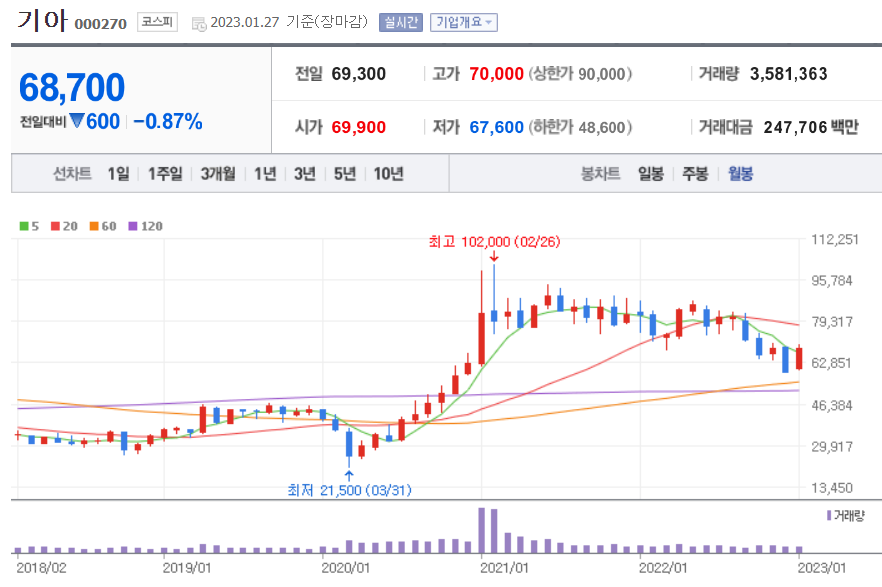 기아는 2020년 코로나로 인한 경제상황 악화로 21,500원까지 떨어졌으나, 전기차에 대한 열망으로 인해 2021년도 1월 약 5배 가까운 주가 상승을 바탕으로 102,000원까지 상승한 바 있었습니다. 하지만, 그 이후 매도세가 지속되면서 주가는 5만 원대까지 떨어지기도 했으나, 4분기 실적이 양호하다는 예상에 올해 1월 들어 좋은 흐름을 가져가고 있습니다. 2023년에는 전고점까지 달성할 수 있을지가 관건이겠습니다.