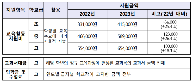 코로나19 시기 저소득층 학생의 교육격차 완화와 교육기회 보장을 위해, 초, 중, 고등학생들의 교육활동지원비를 전년도 대비 약 23.3% 인상하였습니다. 의료급여는 기존과 동일하게 급여 대항 항목에 대한 의료비 중 수급자 본인 부담금액을 제외한 전액을 지원하는 것은 그대로 유지하 됩니다.