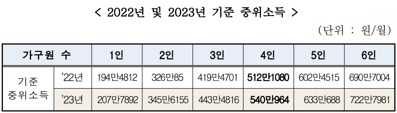 중위소득은 전 국민을 100명이라고 가정하면, 소득이 50번째인 사람을 말하는 게 중위소득입니다. 4인 가구 기준 540만 원이 2023년도 중위 소득 기준입니다.