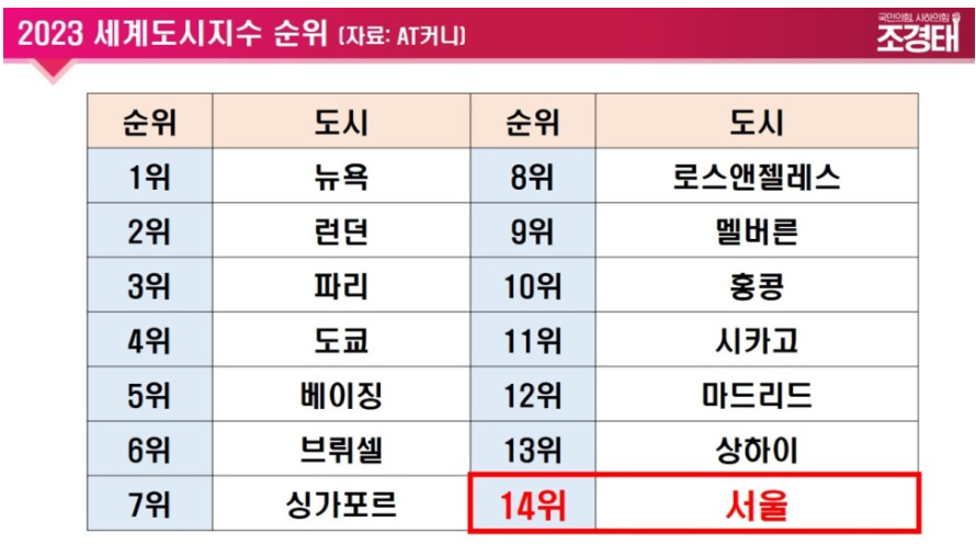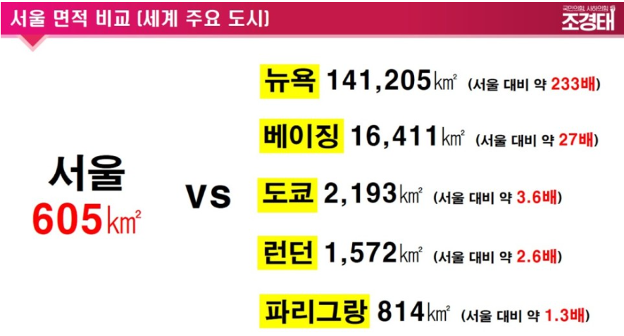 세계 도시 순위에서도 서울은 14위를 기록하고 있으며, 주요 도시들의 면적과 비교를 해보아도, 서울은 주요 도시에 비해 매우 작은 규모를 나타내고 있습니다. 2012년 만해도 서울은 도시 경쟁력이 8위였지만, 지금은 14위로 추락했으며, 이는 매년 추락할 위기를 맞이하고 있습니다. 또한, 경쟁 도시들이 메가시티로 변하는 동안 서울은 규모가 그대로였으며, 뉴욕의 경우에도 서울의 233배의 크기를 자랑하며, 일본의 경우에도 도쿄는 서울에 비해 3.6배나 더 큰 면적을 자랑하며 세계 4위에 올라와 있습니다.