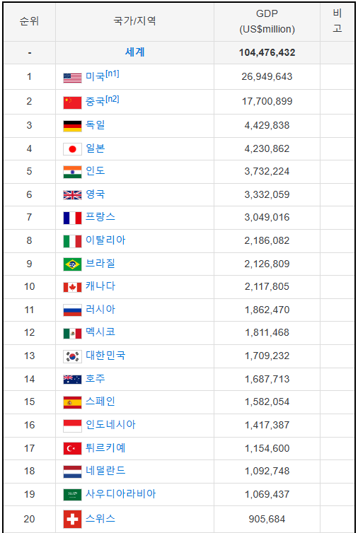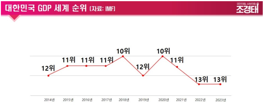대한민국의 GDP는 2018년과 2020년에 10위에 오른 이후, 2022년과 2023년에는 13위로 순위가 하락하고 있으며, 이는 조만간 14위인 호주와 15위인 스페인에도 따라 잡히고, 16위인 인도네시아에도 따라 잡힐 위기에 처해있습니다.