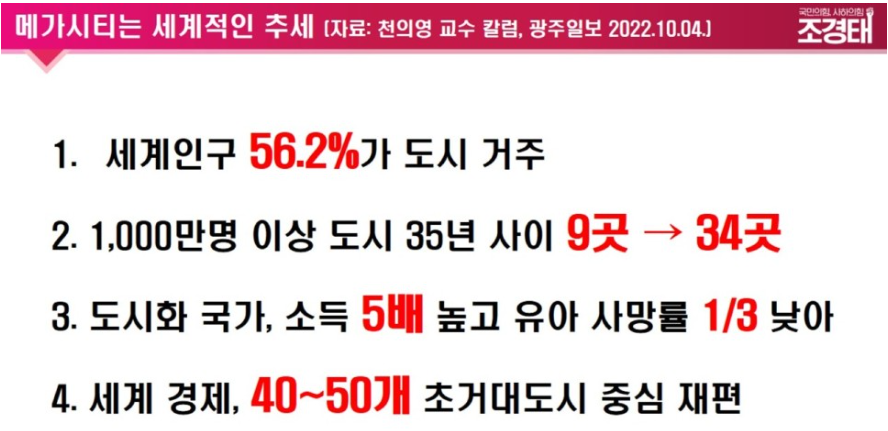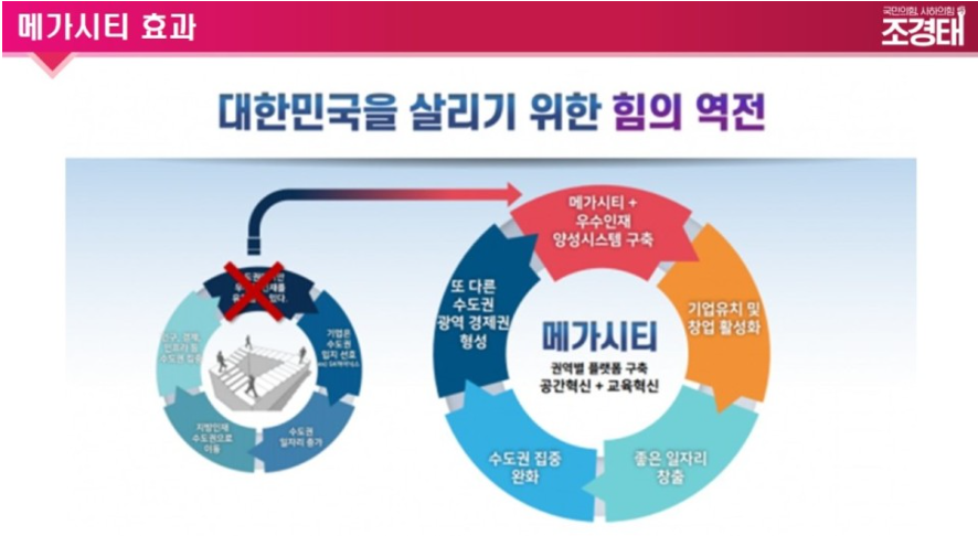 메가시티란 핵심도시를 중심으로 일일 생활이 가능하도록 기능적으로 연결된 대도시권을 말하며, 혁신을 통하여 날로 하락하는 대한민국의 경쟁력을 다시 높여 제2의 도약으로 이끌 필수사항이라고 생각합니다. 조경태 위원장은 메가시티를 통하여 도시경쟁력뿐만 아니라 결국 국가 경쟁력을 키우는 것이며, 세계의 경쟁 도시들에 비해 경쟁력이 떨어지고 있는 서울을 살리기 위해 메가시티로 나야 가야 한다는 주장입니다.
