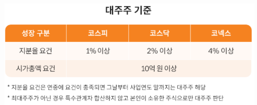 현재 대주주의 기준은 코스피 기준으로 지분율이 1% 이상, 코스닥 기준으로 2% 이상, 코넥스 기준으로 4% 이상일 때, 그리고 10억 원 이상일 때는 대주주 기준에 속하게 됩니다. 따라서, 코스피 종목으로 지분율이 1% 이하더라도, 금액으로 10억 원이 넘게 되면, 대주주가 됩니다.