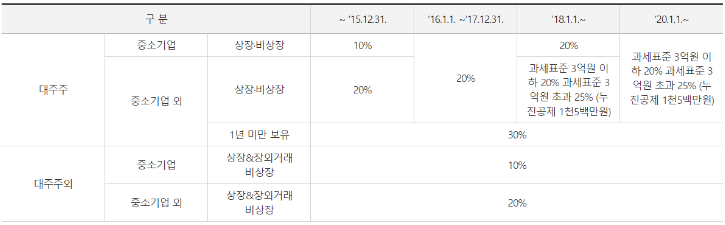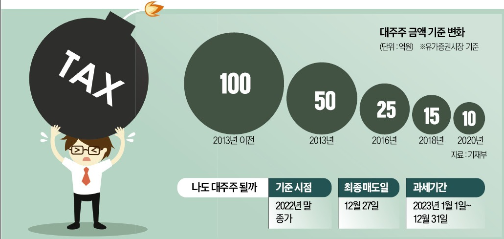 2013년 이전에는 대주주 양도세 기준이 100억 원으로 책정이 되었었는데, 2013년도에는 50억 원, 2016년에는 25억 원씩 약 반토막씩 줄어들어서, 2020년 대주주 양도세 기준은 10억원으로 하향 조정된 바 있습니다.