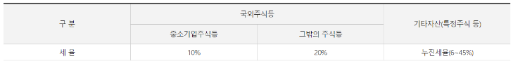 개인이 해당 주식을 10억 원을 보유하고 있다면, 대주주 요건에 들어가게 되지만, 양도소득과세표준은 3억 원이 기준입니다. 따라서, 3억원이하의 주식을 매도했다면, 20%의 세율이 적용되며, 3억원 이상의 주식을 매도하게 되면 3억원 초과액에 대해서는 25%의 세율이 적용됩니다. 또한, 주식 보유기간이 1년 미만일 경우에는 무려 30%의 양도세율이 적용되게 됩니다.