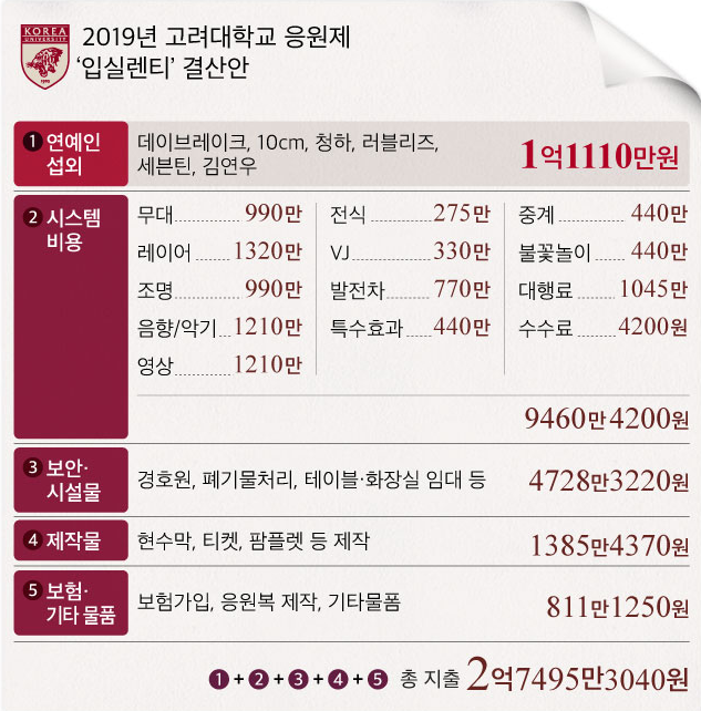 실제로 2019년도 고려대학교 축제때 사용된 비용을 따져보면, 연예인 섭외비로 데이브레이크, 10cm, 청하, 러블리즈, 세븐틴, 김연우 등 총 6명을 섭외하는데, 1억 1110만 원이 들었으며, 그 이외 시스템 비용 등의 무대 비용에 약 1억 원을 사용했으며, 보안, 시설물, 제작물 등 총 2억 7500만 원이 사용되었습니다. 하지만, 같은 해 연세대학교보다 더 적은 비용을 사용한 것으로 알려지면서, 연세대학교는 3억 원이 넘는 비용이 사용되었을 가능성이 높은데, 2023년 인플레이션이 하늘을 찍고 있는 상황에서 대학교 축제를 위해, 사용된 비용은 5억 원은 될 것으로 예상되고 있습니다.