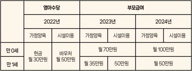 정부에서는 신생아부터 24개월까지의 자녀에 대한 영아수당에서 2023년과 2024년 가정양육비와 시설이용비를 대폭 늘리기로 결정했습니다. 또한, 육아휴직도 1년 6개월로 확대를 검토중이며, 육아기 근로시간 단축제도 대상 자녀의 연령도 8세에서 12세 이하로 확대하고 육아휴직에 대한 사용제한도 완화하기로 결정했습니다.