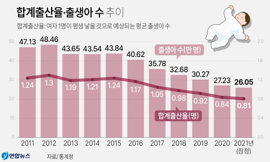 대한민국 출산율은 2015년 12월부터 83개월 연속으로 전년 동월 대비 감소를 기록하고 있습니다. 2022년 10월 출산된 신생아수는 20,658명으로 지난해 동월대비 91명 적게 태어났습니다. 반면에, 올해 10월 사망자수는 작년 동월 대비 2,013명(7.3%) 증가한 29,763명으로 동월 기준 최대치를 기록했습니다. 즉, 매월 약 1만명씩 대한민국의 인구가 줄어들고 있는 상황입니다.