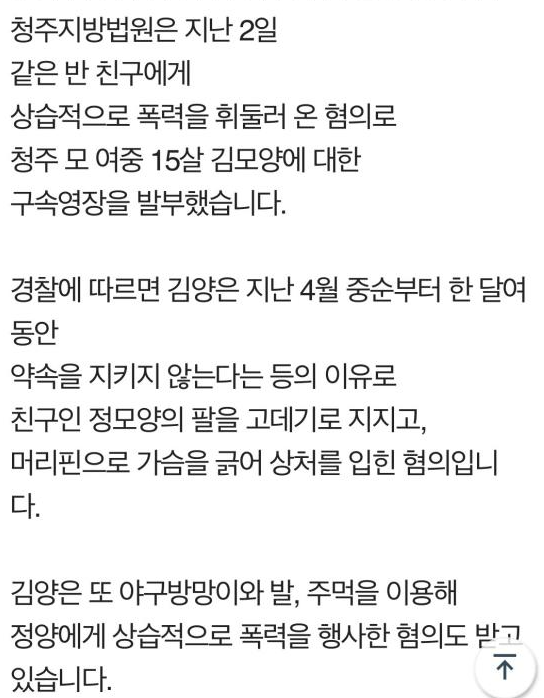 이로써, 청주지방법원은 같은 반 친구에게 상습적으로 폭력을 휘둘러 온 혐의로 청주 모여중 15살 김모양에 대한 구속영장을 발부하였으며, 경찰에 따르면 김양은 지난 4월 중순부터 한달여동안 약속을 지키지 않는다는 등의 이유로, 친구인 정모양의 팔을 고데기로 지지고, 머리핀으로 가슴을 긁어 상처를 입힌 혐의입니다. 또한 김양은 야구방망이와 발, 주먹을 이용하여 정양에게 상습적으로 폭력을 행사한 혐의도 받고 있습니다.