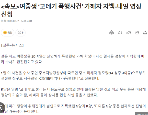 2006년 충북지방경찰청에 따르면, 피해자인 J여중 14살 정모양으로부터 절친한 친구로 지목되었던 15살 K양이 자신이 폭행했다고 진술했습니다. K양은 일명 고데기로 불리는 미용도구를 사용하여 정모양의 가슴과 팔, 허벅지 등에 상처를 입힌 사실 등을 시인했으며, 정양이 취재진에게 범인으로 지목했던 S양과 K양, 또 다른 S양 등은 현재로서는 진범이 아닐 가능성이 높아졌다는 기사입니다.