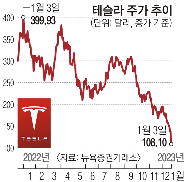 테슬라 주식이 2022년 1월 3일 $399.93을 보이며 승승장구하더니, 2023년 1월 3일 $108.1까지 약 70% 급락을 하자, 캐시우드는 본인의 아크 인베스트의 여러 ETF에서 테슬라 주식 비중을 계속 높여가고 있습니다.