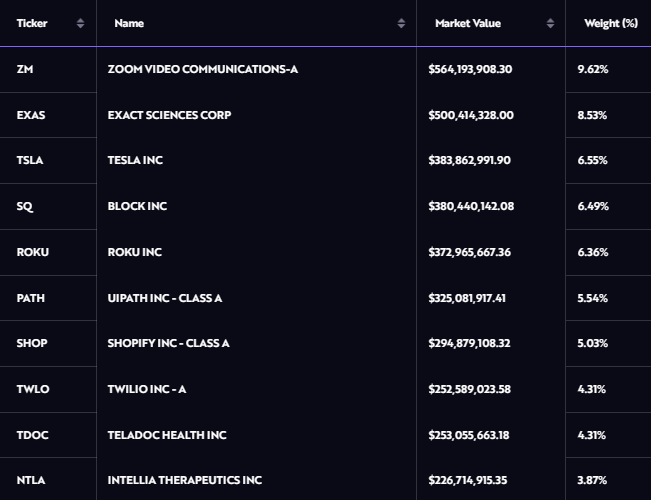 캐시우드의 아크 인베스트의 비중을 나타낸 표인데요, 줌 비디오가 9.62%로 가장 높으며, 테슬라는 6.55%의 비중으로 3위를 나타내고 있습니다.