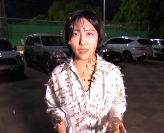 한 기자가 약 10분 정도 서있어 보았는데요, 동양하루살이 수백 마리가 기자 몸에 붙기 시작하더니, 기자의 머리와 머리카락, 상의와 하의, 신발까지 온몸에서 떠나지 않고 있습니다. 벌레가 몸에 한 마리라도 붙어있으면 난리를 치는 여자들인데도 불구하고, 기자의 직업은 대단한 것 같습니다. 시민에게 더 생생한 정보를 주기 위해, 굳이 이런 위험을 무릅쓰고 촬영을 하였는데요, 사실 이 동양하루살이는 인간에게 어떠한 피해도 주지 않는다고 합니다.