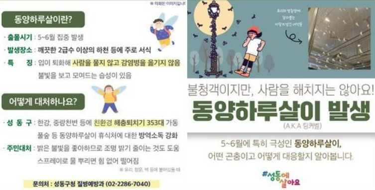 동양하루살이는 몸길이가 3cm, 날개를 펼치면 5cm정도까지 커지며, 동양하루살이들은 보통 5월 중하순부터 활동을 하곤 하는데, 최근 더위가 빨리 찾아온 나머지 좀 더 일찍 찾아왔으며, 동양하루살이의 양도 더 커지기 시작했습니다. 이 때문에 한강 주변 성동구에는 약 2주 만에 약 100건에 달하는 민원이 쏟아졌다고 합니다. 이 동양하루살이들은 한강변에 수없이 많은 애벌레가 발견이 되었는데요, 애벌레가 한강에서 살다가 허물을 벗어던진 후, 불빛이 많은 도심지역으로 날아간 것으로 파악되고 있습니다.