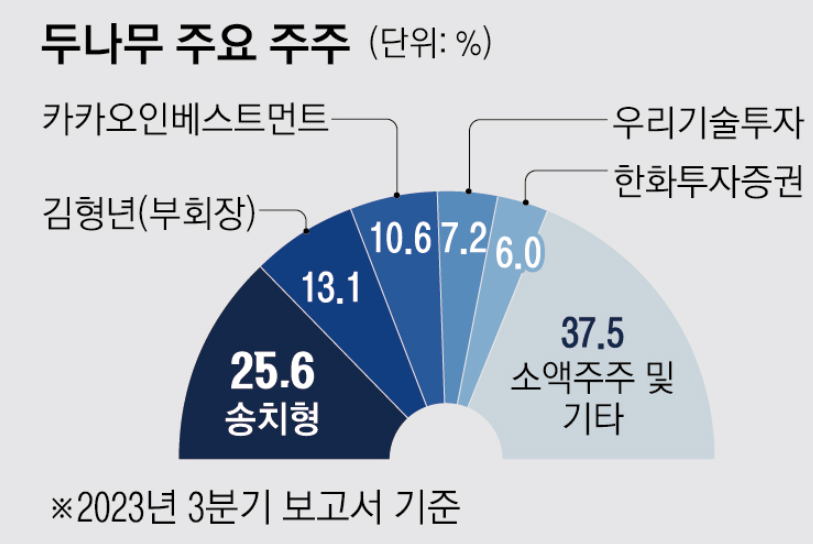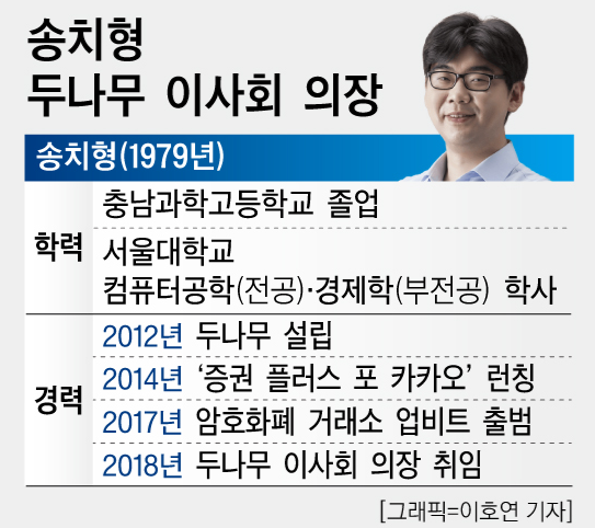 송치형은 두나무의 25.6%를 보유하고 있는 최대주주로, 재산이 약 5조원에 이른다고 합니다.