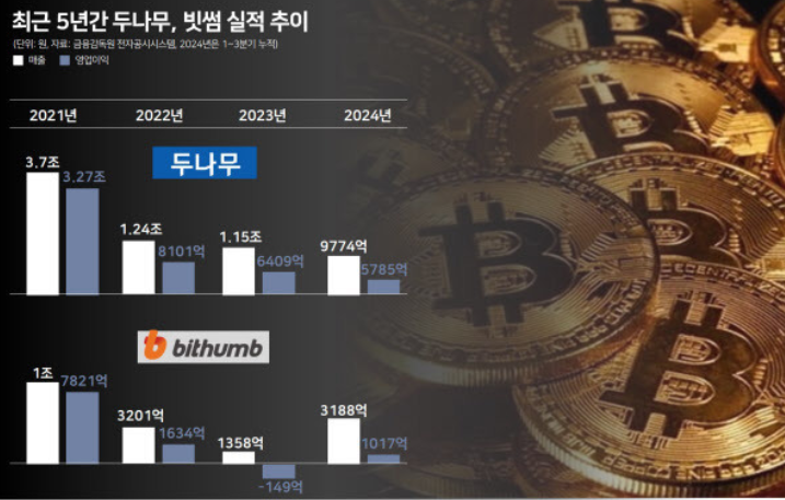 한편, 빗썸은 2024년 3분기 매출 689억 원, 영업이익 74억 원, 당기순이익 31억 원을 기록하였습니다. 두나무와 비교하여 매출 및 영업이익 규모는 작지만, 전년 동기 대비 실적이 개선된 것으로 나타났습니다.