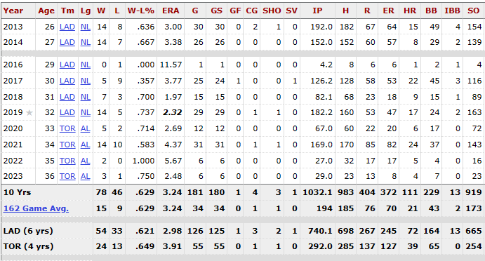 그리고, 2019년도 FA를 앞두고 182이닝, 14승 5패, 방어율 2.32를 기록하며, 사이영상 2위, 올스타, MVP19위를 기록하며 화려한 부활을 예고하며, FA 대박을 기대하게 되었으며, 토론토와 4년 8천만 달러라는 거액으로 계약을 하게 됩니다. 토론토에서의 첫 시즌인 2020년도에는 코로나로 인해, 단축경기를 하며, 67이닝, 5승 2패, 방어율 2.69라는 아메리칸리그에서는 경이적인 기록을 세우며, 사이영상 3위, MVP 13위를 달성하였으나, 2021년도에는 169이닝, 14승 10패, 방어율 4.37을 기록하는 등 부상까지 당하여, 2023년 하반기에 복귀하게 됩니다.