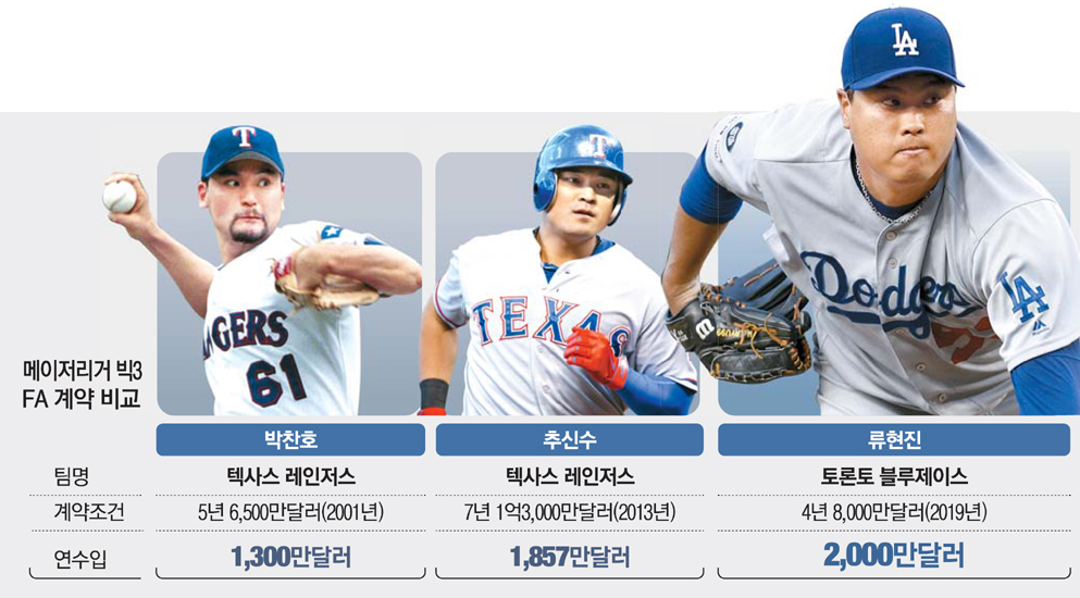 코리안 특급 박찬호는 대한민국에 메이저리그를 널리 알린 선구자로서, 2001년 텍사스 레인저스와 5년 6500만 달러의 계약을 달성하며, 연수입 1300만 달러를 벌여드렸으며, 추신수는 텍사스 레인저스와 7년 1억 3천만 달러, 연수입 1857만 달러의 계약을 성사시켰습니다. 총 계약금액으로는 추신수가 가장 많은 금액을 성사시켰으나, 연봉으로 보면 류현진선수가 가장 많습니다. 이제 류현진 선수가 3년 5천만 달러의 계약을 성사시킨다면, 추신수 선수와 같은 기간에 같은 금액이 될 것 같지만 어느 팀이든지 3년 계약은 리스크가 크기 때문에 최대 2년이 예상됩니다. 하지만, 악마 에이전트인 스캇 보라스가 어떤 마법을 부릴지가 관건이며, 앞으로 시즌을 지금과 같이 건강하게 마무리한다면 좋은 계약이 기다려질 것 같습니다.