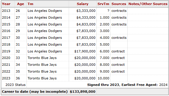 류현진은 2019년도 12월 22일 토론토 블루제이스와 4년 80M의 계약을 체결했으며, 옵트아웃도 없고, 트레이드 거부권까지 받은 바 있습니다. 1년에 2천만 달러의 계약이며, 한화로 연봉 약 260억이니, 하루에 0.7억, 즉 7천만 원씩 벌고 있는 엄청난 선수입니다. 이제 토론토 블루제이스와의 4년 계약이 올해 마무리될 예정이며, 류현진 선수는 다시 한번 FA를 노리고 있습니다.