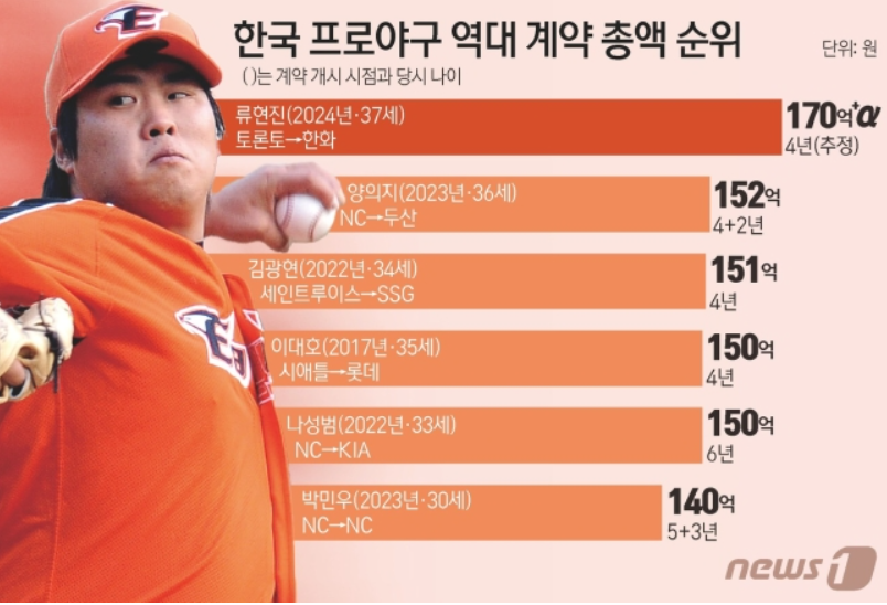 전 토론터 블루제이스 소속이었던 류현진이 한화 이글스로 복귀한다는 소식입니다. 류현진은 한국 프로야구 사상 최고의 몸값을 기록할 예정이며, 4년 계약에 170억 원이 보장되며, 추가로 인센티브 계약만 마무리된다면, 금일 내로 계약을 한다는 소식입니다.