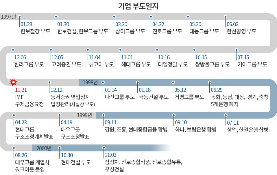 그 당시 재계 2위였던 대우가 금융부채 70조원을 갚지 못하고 1999년 파산하게 되었으며, 대우를 포함하여 수백수천 개의 기업들이 연쇄 부도가 났으며, 대부분의 자영업자들도 파산하게 되었습니다. 환율은 1997년 12월 1,995원/$ 까지 올랐으며, 코스피지수는 1998년 277.37 포인트까지 떨어지게 되었었죠. 지금 서울의 강남이나 여의도에 있는 빌딩들은 그당시 저렴하게 구매했던 외국인 소유가 굉장히 많습니다.