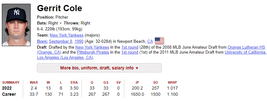 3) 올해 퍼포먼스 : 200이닝을 넘게 던지며 양키스의 1선발 역할을 잘 해주었습니다. 방어율은 3.50이며, 삼진은 257개나 잡을 정도로, 160km의 직구로 상대를 압도하는 퍼포먼스는 속이 다 시원할 정도입니다.