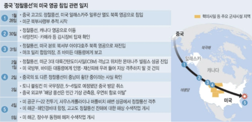 미국은 몬태나주 상공에서 격추시켰다고 밝히며, 몬태나주에는 미국의 3개 핵미사일 격납고 중 한 곳인 맘스트롬 공군기지가 위치해 있어, 정찰기구가 정보수집 목적으로 비행했을 가능성이 제기되고 있습니다. 또한, 이 기지에는 150개의 대륙간 탄도미사일 격납고가 있다고도 밝혔습니다. 현재 미국은 몬태나주 빌링스 공항을 폐쇄했으며, 주미 중국대사관, 주중 미국대사관을 통해, 중국 당국과 접촉하여 문제를 제기하고, 미국 본토와 미국민을 보호하기 위한 필요한 모든 조치를 취할 것을 분명히 했다고 밝혔습니다.