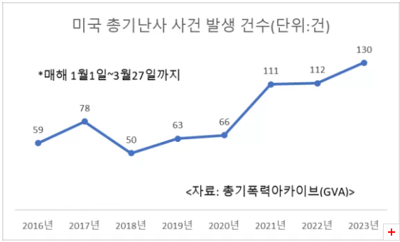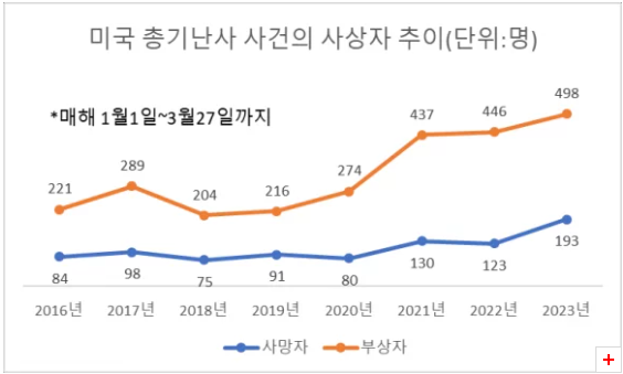 2018년도 1분기에만 50건의 총기난사 사건이 발생하였으나, 2023년 1분기 3월 27일까지 미국에서 무려 130건의 총기난사 사고가 발생하여 최다 발생건수를 초과하고 있습니다. 거의 매년 미국에서는 총기난사 사건 발생수가 증가하고 있으며, 미국 정부는 아직도 총기에 대한 규제를 하지 않고 있습니다.