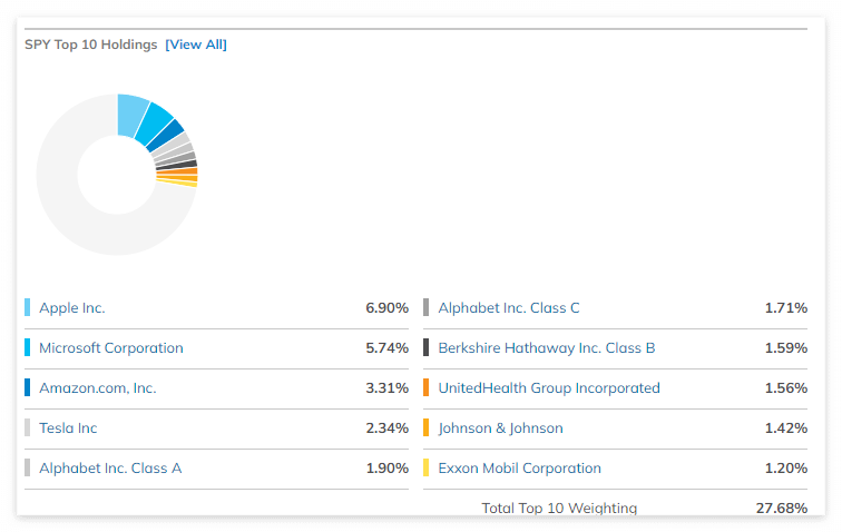 SPY 주요 종목에는 역시 세계 1등 주식인 애플(APPLE)이 6.9%로 가장 많은 비중을 차지하고 있으며, 마이크로소프트(MS)가 5.74%로 2위를 차지하고 있습니다. 마소는 영업이익률 부분에서 세계 최고인 기업이니 높을 수밖에 없다고 보입니다. 3위는 아마존, 4위는 테슬라, 5위는 알파벳이 차지하고 있네요. 개인적인 생각으로는 아마존 주식을 줄이고 테슬라 주식비중을 높이는 것이 더 효율적이라고 생각됩니다.