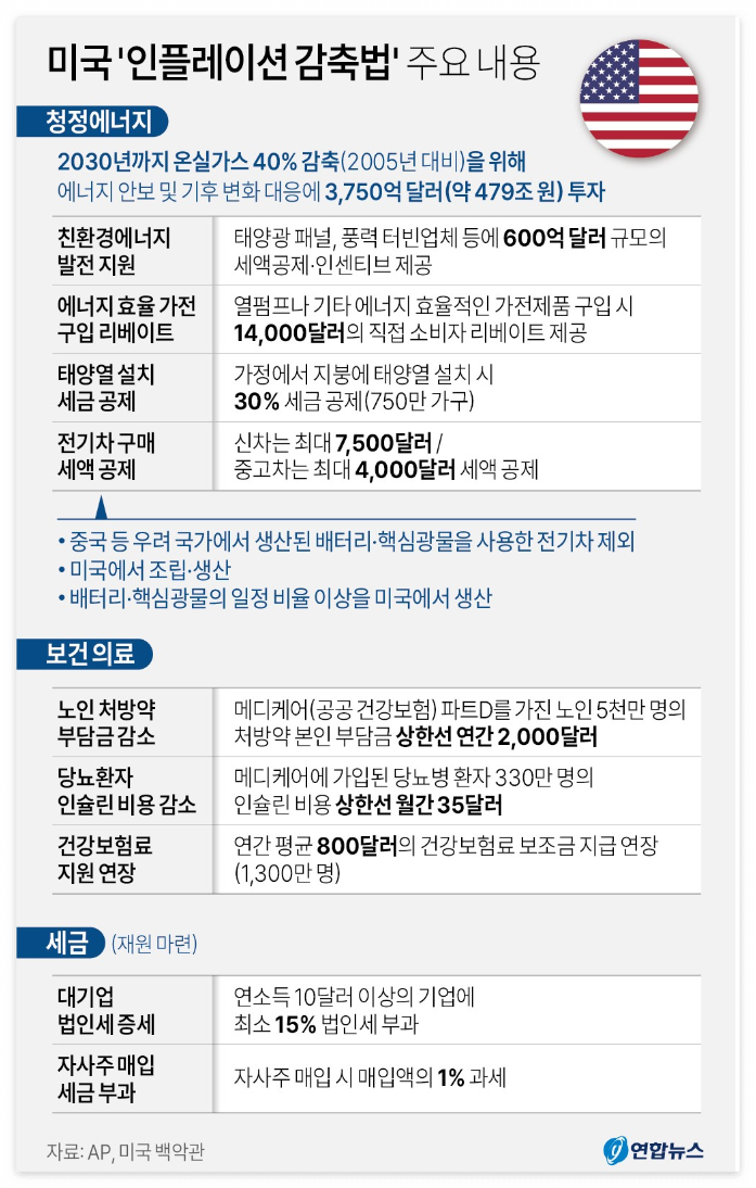 3. 내용 : IRA라고 하는 '인플레이션 감축법'은 기후변화 대응, 의료비 지원, 법인세 인상 등을 골자로 한 미국의 법안으로, 급등한 인플레이션 완화를 위해 법안이 시행되었습니다.