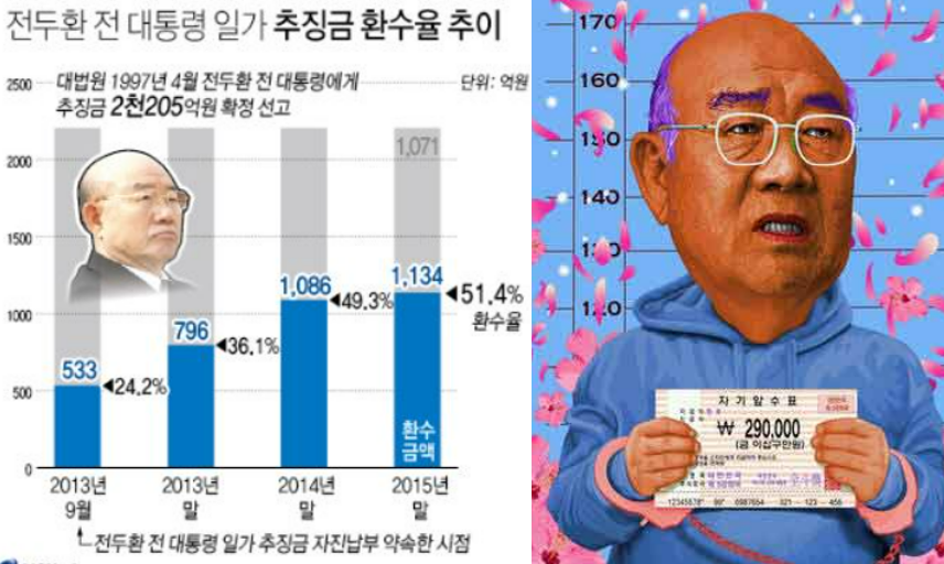 전두환은 1997년 대법원 판결에서 추징금 2205억원을 선고받았으나, 본인은 현금 29만 원밖에 없다며 추징금을 내지 않다가, 검찰 조사로 전두환 가족이 보유한 재산을 몰수하여 1134억 원까지 환수했으나, 아직도 약 1천억 원이 남아있는 상태에서 전두환 대통령은 2021년에 사망하게 됩니다. 1987년 전두환은 법원으로부터 무기징역을 선고받았으나, 1997년 김영삼 대통령은 전두환을 특별사면시켰으며, 전두환은 '회고록 쿠데타'를 통해, 본인의 죄를 절대로 뉘우치지 않았으며, 5.18 민주화운동을 폭동이란 말 이외에는 달리 표현할 말이 없다고 주장하였습니다.