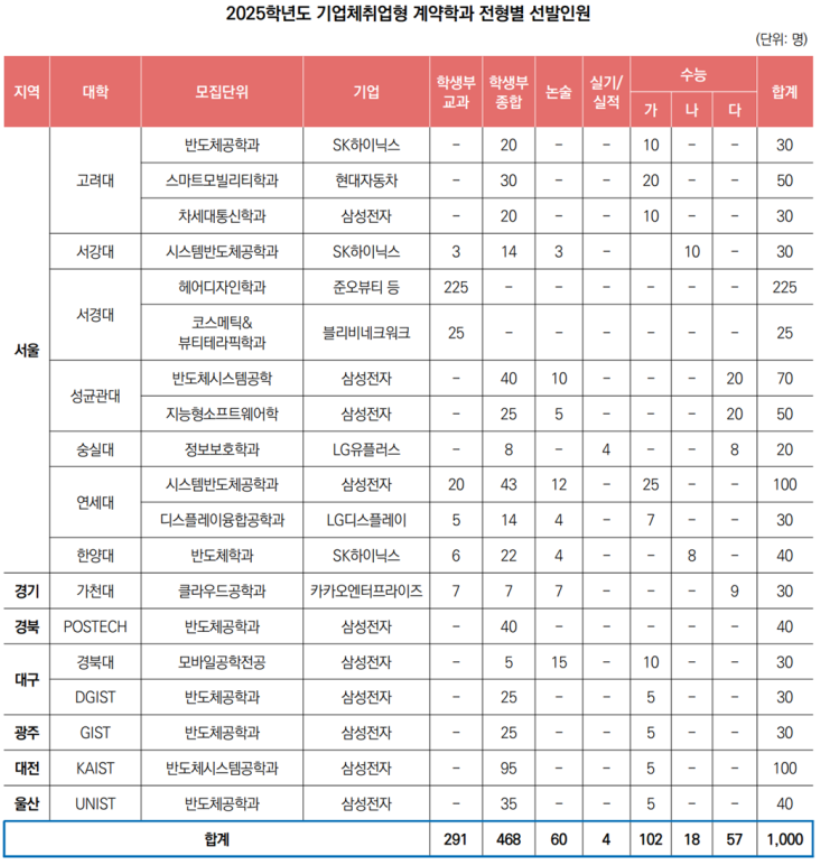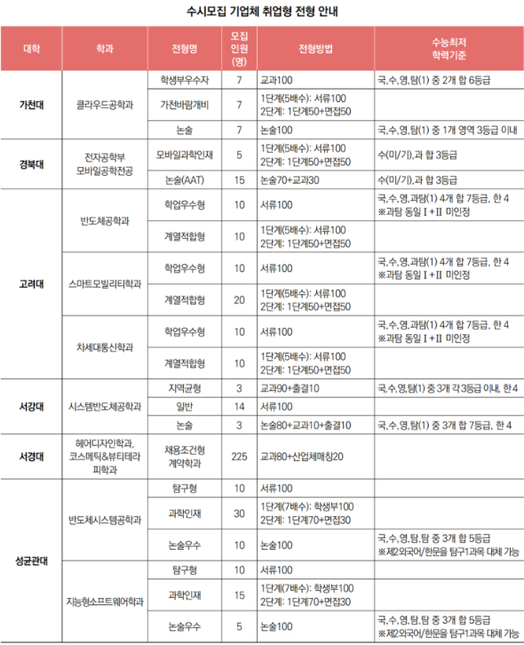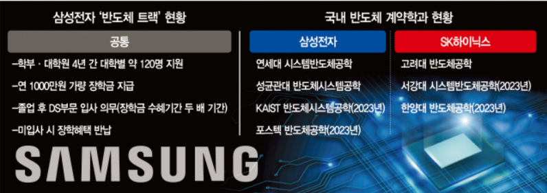 삼성전자의 경우에는 연세대 시스템반도체공학과, 고려대 차세대통신학과, 성균관대 반도체시스템공학, 지능형소프트웨어학, 카이스트, 포스텍 , UNIST, GIST, DGIST, 경북대 등을 선발하고 있으며, SK하이닉스는 고려대 반도체학과, 서강대 시스템반도체공학과, 한양대 반도체학과 등을 선발하고 있습니다. 그 이외에, LG디스플레이, LG유플러스, 카카오엔터프라이즈, 준오뷰티 등도 기업과 협약을 맺은 계약학과입니다.