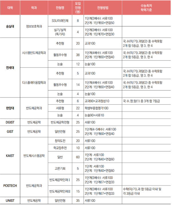 삼성전자와 협약이 되어있는 연세대 시스템반도체학과의 경우, 추천형으로 20명을 선발하는데, 교과성적 100% 수능최저학력기준을 충족해야 하며, 활동우수형으로 38명을 선발하는데, 이는 1단계로 4 배수를 뽑은 후, 2단계 면접에서 40%을 반영하게 됩니다. 또한, 논술로도 12명을 선발합니다.