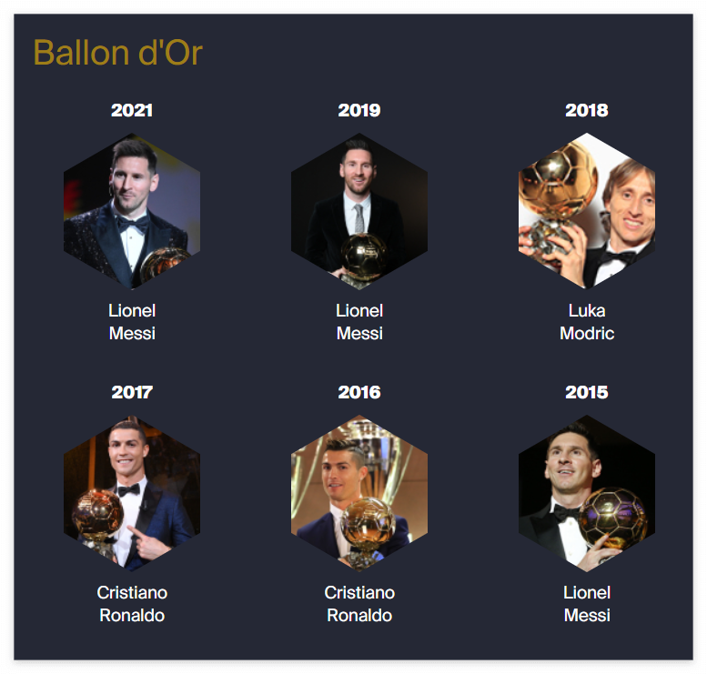 2018년에는 크로아티아의 루카 모드리치가 수상하면서, 메시와 호날두의 시대가 끝나는가 싶었지만, 2019년과 2021년에 다시 리오넬 메시가 수상하면서, 역시 메시의 시대가 이어졌습니다. 참고로, 2020년에는 코로나 바이러스로 시상이 취소되었습니다.