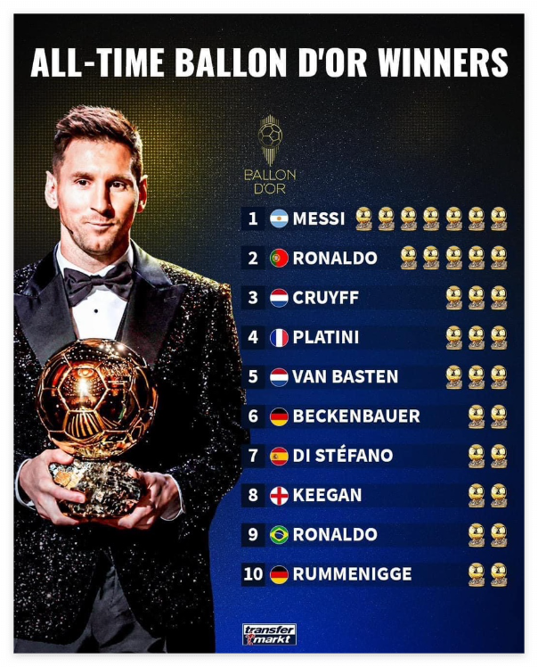 리오넬 메시는 총 7번의 발롱도르를 수상하여, 최다 발롱도르 수상자가 되었으며, 그 뒤로는 크리스티아누 호날두가 5번 수상하면서 2위를 기록하고 있습니다. 공동 3위는 네덜란드의 전설인 요한 크루이프가 3차례 수상하였으며, 또 다른 네덜란드 선수인 마르코 반 바스텐도 3회 수상하였으며, 프랑스의 레전드인 미셸 플라티니도 1983년부터 1985년까지 연속 3회 수상을 하였습니다.