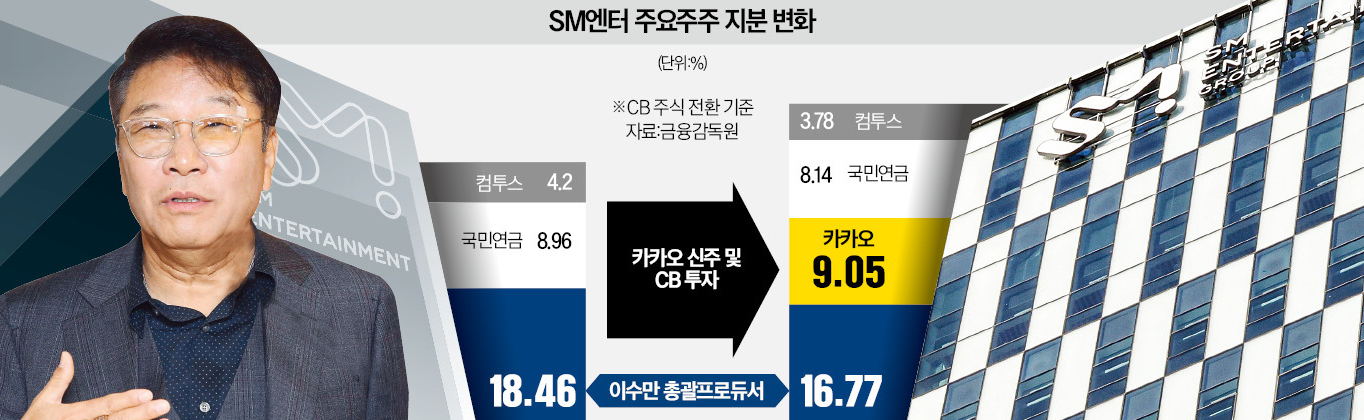 에스엠의 SM의 약자는 이수만의 약자로서, 이수만이 현재 16.77%의 지분을 가지고 있는 최대주주이며, 2월 7일 카카오가 SM의 3자 배정 유상증자 형태로 참여하여, 총 9.05%의 지분을 확보하게 되며, SM의 2대 주주가 되었습니다. 이에 이수만은 최대주주와 어떤 협의 없이, SM 이사회가 제삼자에게 신주와 전환사채를 발행하는 것은 명백히 상법에 위반되는 행위라며, 즉각 법적 대응을 위해, 한국으로 귀국하기도 했습니다.